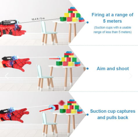 Fácil y divertido de jugar, deja que los niños se conviertan en pequeños héroes geniales. Cuando se lo ponen, pueden imitar la escena de las telarañas filmando como el Hombre Araña en las películas, lo que permite a los niños imaginarse a sí mismos como superhéroes